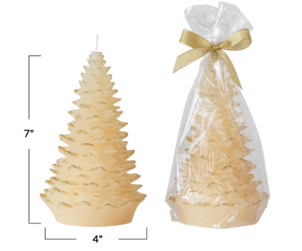 Add a sophisticated touch to the holiday decor with the tall holiday tree-shaped candle. This unscented candle, shaped like a festive tree and finished with gold tips, comes in eggnog and a variety of colors to complement any room or occasion. With an approximate burn time of 36 hours, it's designed to provide a long-lasting, tranquil flame. The combination of high-quality wax and a cotton wick ensures a clean burn, while its size of 4 inches round by 7 inches high makes it a versatile choice for holiday centerpieces or as a thoughtful gift.