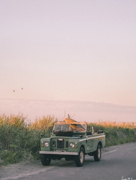 "Follyday Rover" photo print of a single fin surfboard and a Land Rover at sunrise in Folly Beach, SC.