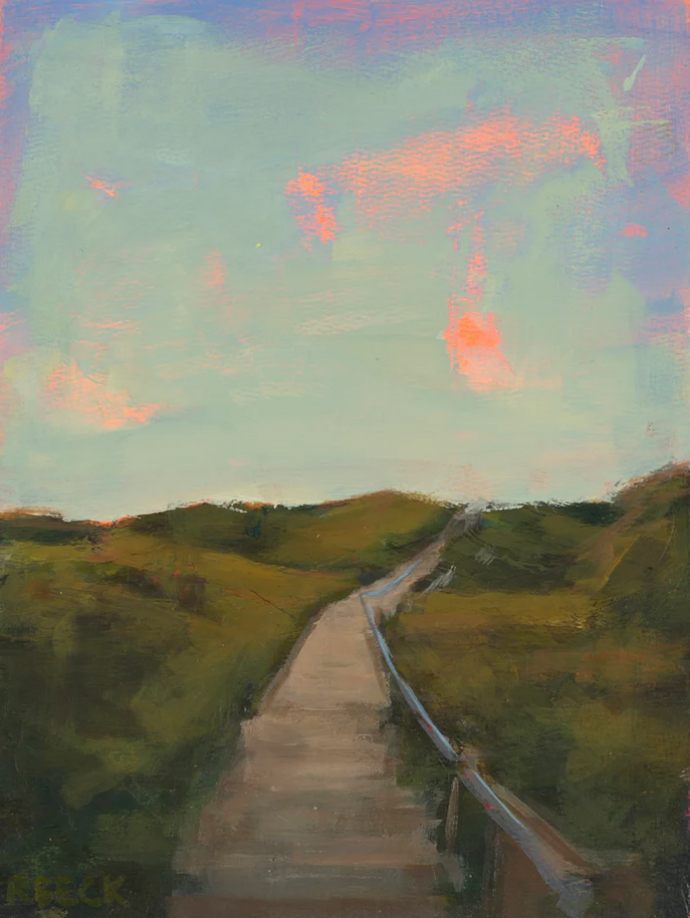 The Way Home invites you along a glowing beach path—nestled between sun-lit dunes, beneath a sky of soft pinks and coastal blues. This vertical composition blends fun, contemporary flair with the timeless ease of the shoreline, creating a moment of light, movement, and possibility